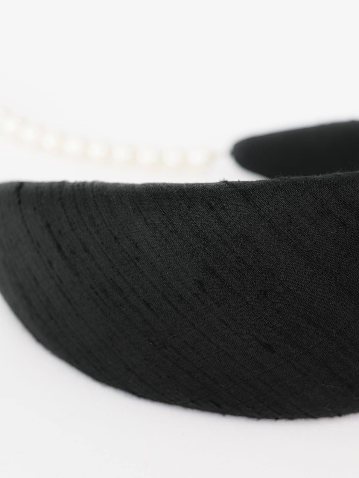 シルクサテンの土台にコットンパールをネックレスの様に仕上げたヘッドバンド。 土台から全て手仕事で着け心地よく仕上げます。 Size : Free Headband Width : 8cm Material : Silk / Cotton Pearl Colour : Black ご注文を頂いてから製作します。お届けまでに4~8週間かかります。オーダーメイドのため、返品はお受けできませんのでご了承ください。