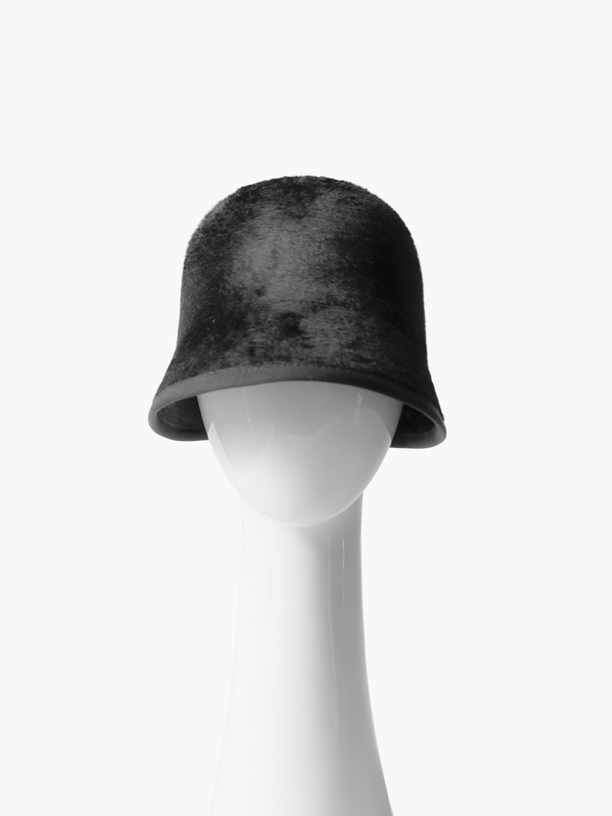 ファーフェルトのロングヘア素材で仕立てた、クラシックなクロシェスタイル。短めのブリムにリボンで縁取りを施し、エレガントでモダンな印象。フォーマルからカジュアルまで、今のスタイルに合わせやすい帽子です。