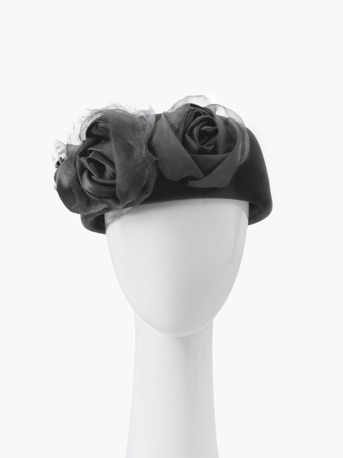 ファーフェルトのピルボックスハット。シルクのバラで表情をつけました。ライニングはシルクコットンです。 Size : S 57cm Height : 10cm Material : Rabbit furfelt / Silk cotton Colour : Black ご注文を頂いてから製作します。お届けまでに2~4週間かかります。オーダーメイドのため、返品はお受けできませんのでご了承ください。