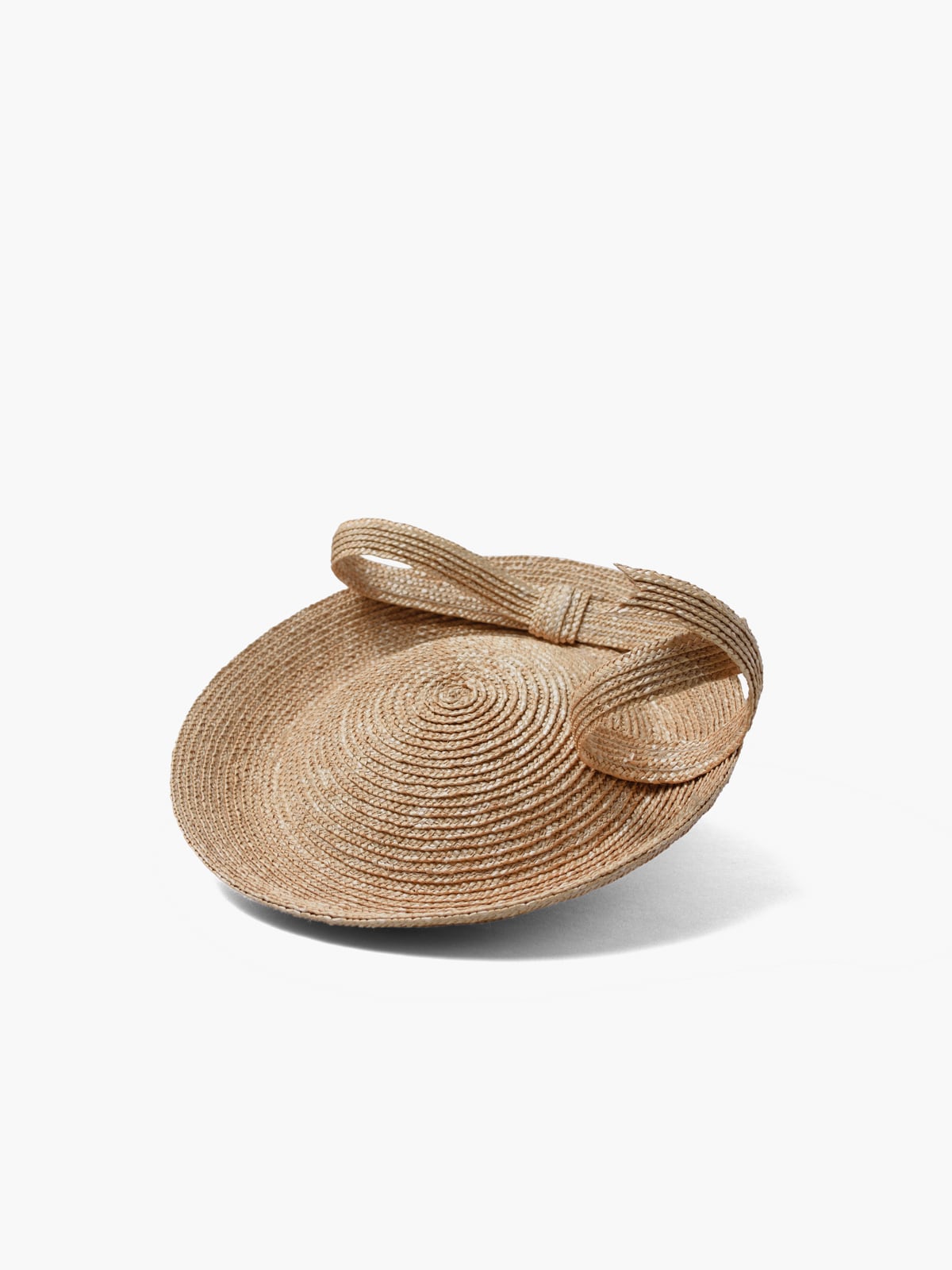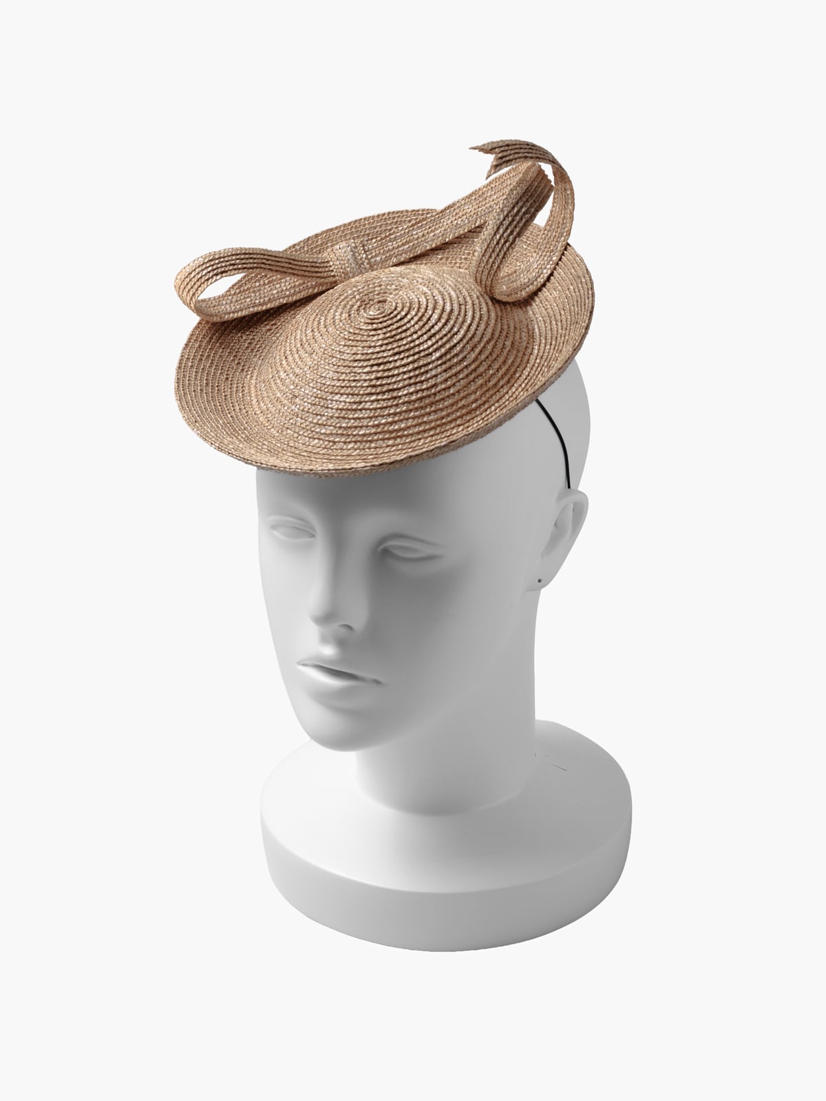 A simple round base is adorned with loops of matching straw braid, arranged like a ribbon to create an elegant design with a sense of movement.