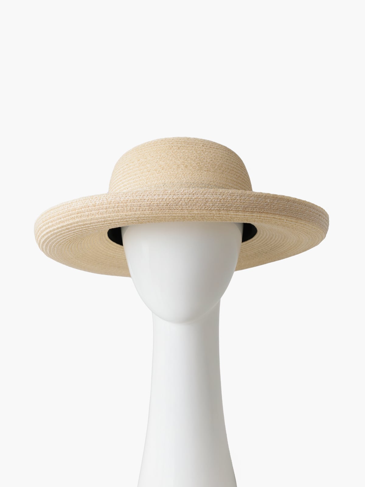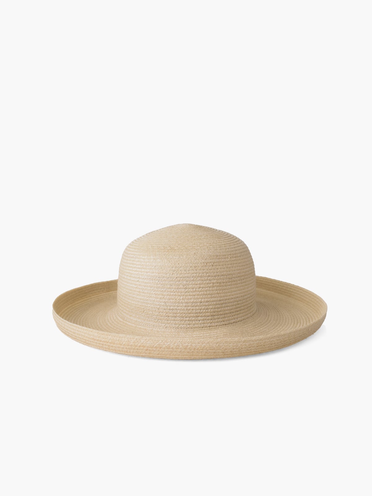 丸角のクラウンと、やや下がり気味のつば広ブリム。先端がわずかに反り上がるシルエット。通気性のあるシゾール素材。日差しをやさしく遮ります。